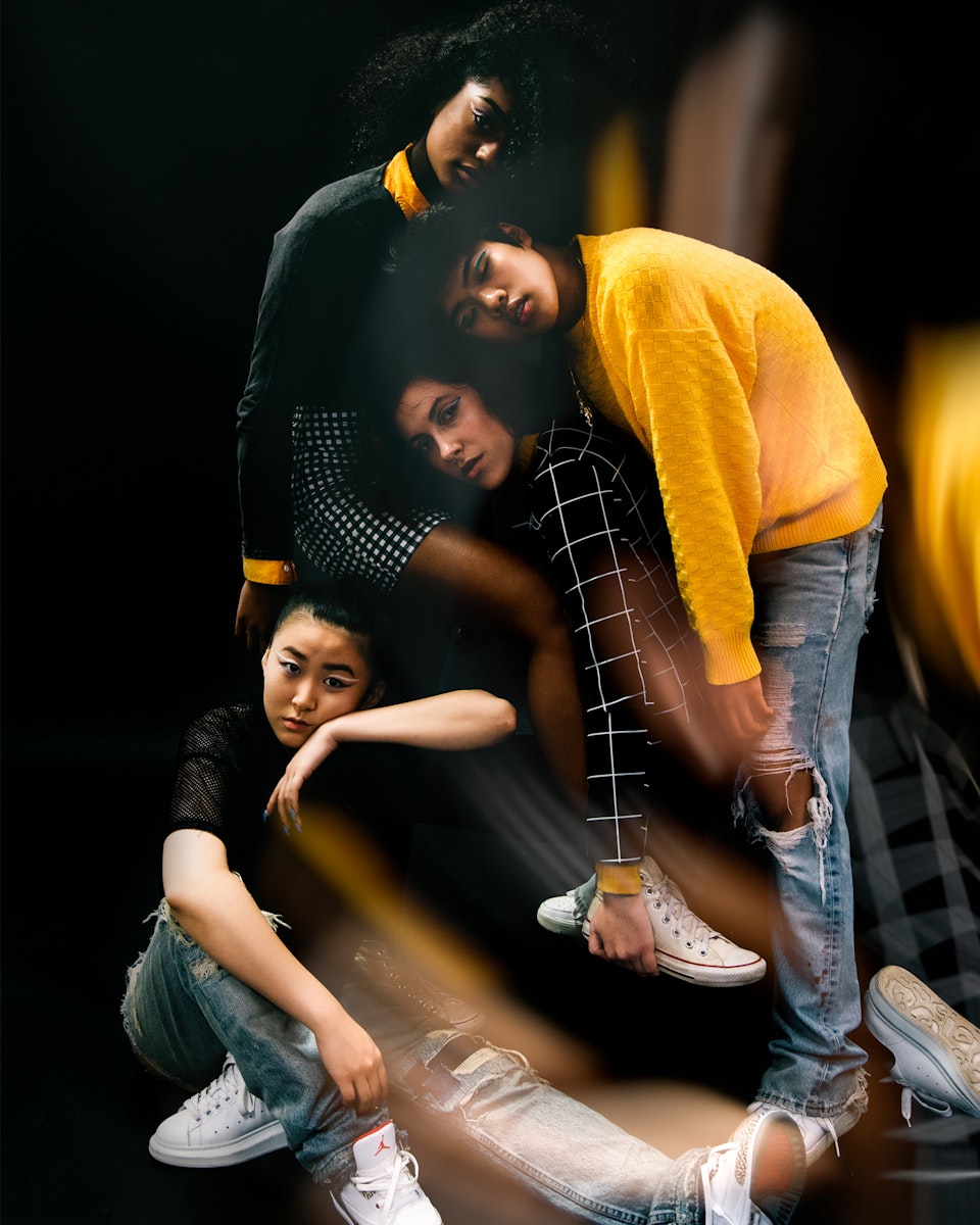 "Berchell and I collaborated for this photoshoot showcasing male companionship and black pride. His designs are about cultural fusion and an exploration of texture and print. He combines African wax prints and athleticwear fabrics to create unique streetwear pieces."
